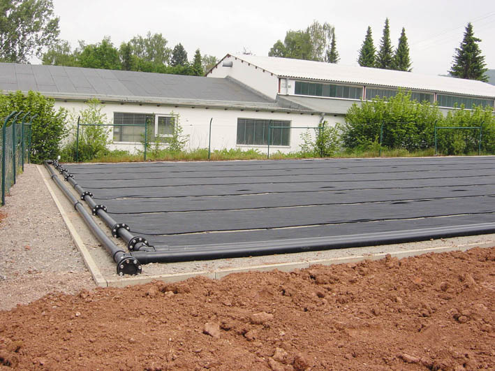 Sie sehen auf den Bildern die Installation einer Solarabsorberanlage für die Beheizung des Freibads Berndorf.